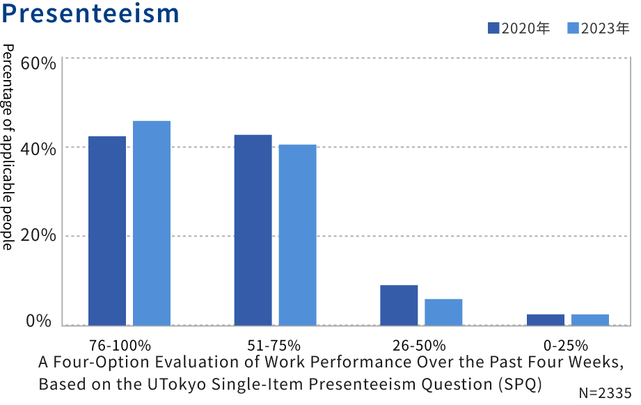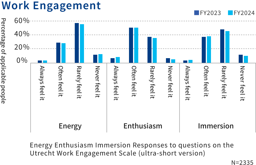 We evaluate work engagement and presenteeism over time and implement measures accordingly. We aim to foster a safe and comfortable corporate culture and build systems by holding seminars on women's health issues and work styles, and providing support for those who have illnesses or disabilities while working (balance support).