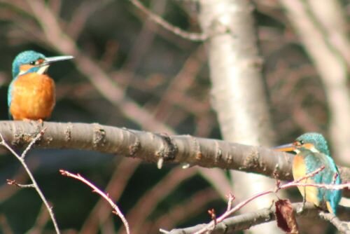 カワセミたちは追いかけっこが好きなのか、下の池の近くをくるくる飛び回ります。