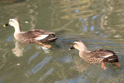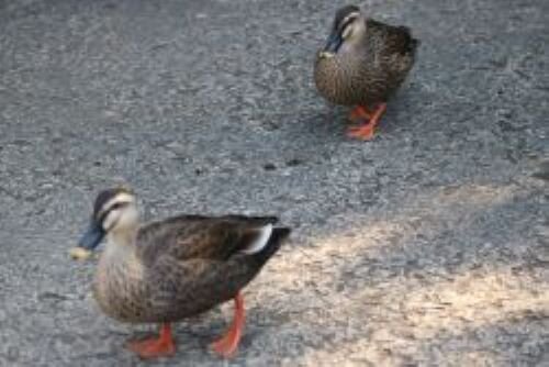 ペタペタと歩きながらこちらへ現れたのはカルガモたち。