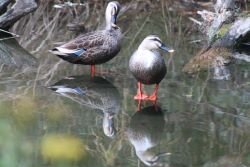 水面にカルガモたちの姿が反射して、とてもきれいですね。