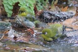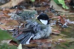 しばらく水浴びの様子を観察していると、シジュウカラの傍に小さな鳥がやってきました。