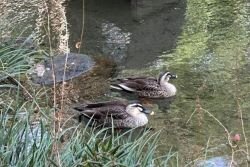 じんわりと陽の光が差し込む中、池にぷかぷかと浮かんでいるのはお馴染みのカルガモたち。
