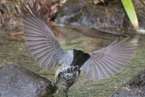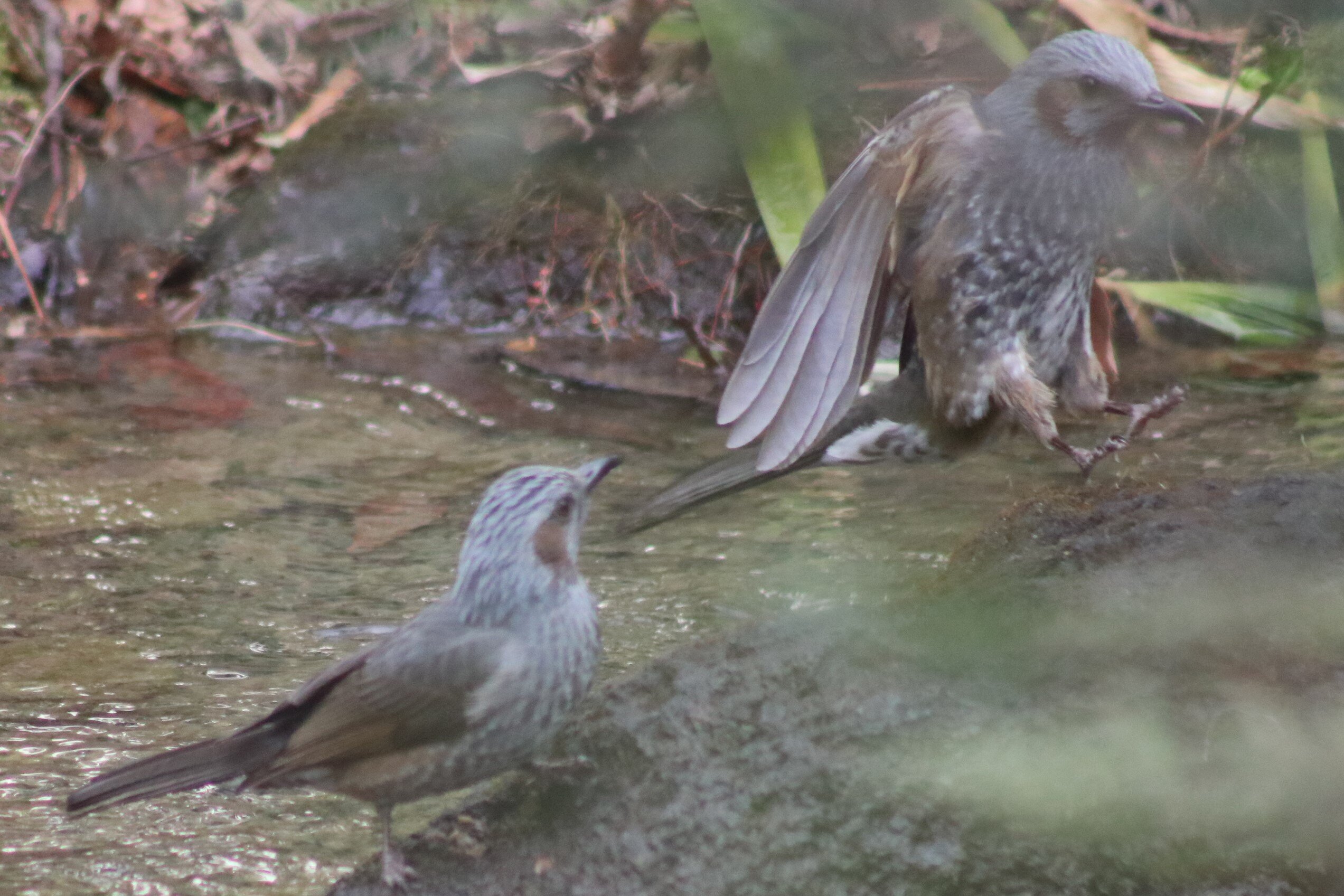 追いかけあいながら、ヒヨドリたちが川へやってきました。