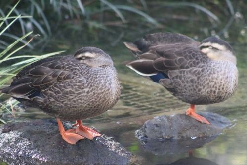 千年の森にも、お昼寝しているカルガモたちを発見!