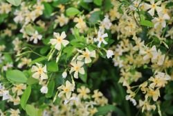 淡い黄色の小ぶりな花をつける、つる性の低木です。