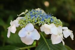 全体的に丸っこくふんわりとした印象のホンアジサイとは異なり、小ぶりでつぶつぶとした青い花の周りを白い花びらが囲むように咲くのがガクアジサイの特徴です。