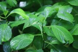 昨夜まで雨が降っていたためか、アジサイの葉が雨露で光っていて、とてもきれいでした。