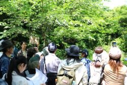はじめに、「千年の森」の概要や、私たちを取り巻く環境問題について簡単に解説した後、園内をご案内しました。講師であるネイチャーリーダー江東スタッフからは、4種類の木の葉を探すクイズも出題され、楽しみながら自然について学んでいただきました。