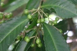 緑色の小さな実を付けている、こちらはマンリョウ。