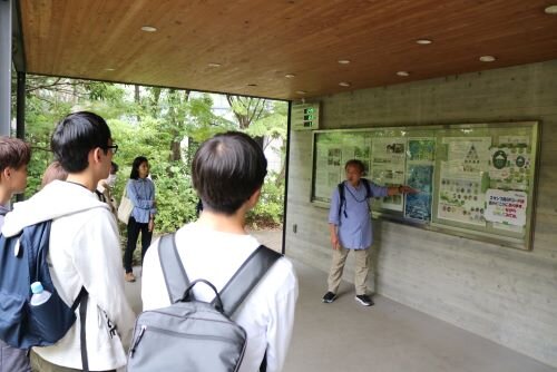東屋にて千年の森の創設の背景や、フジクラの生物多様性保護の取り組みに関する説明を行った後、学生の皆さんに敷地内を見学していただきました。