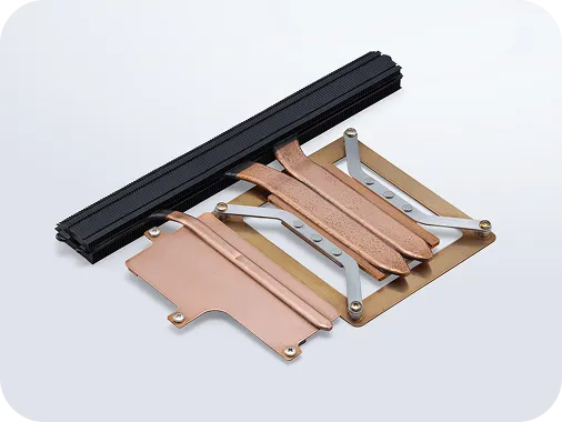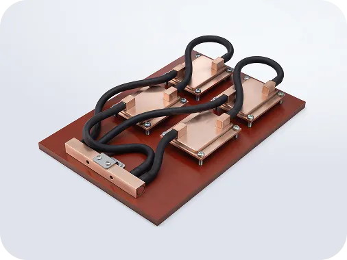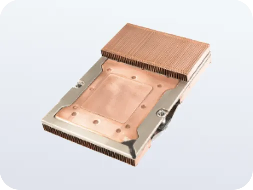 主に熱伝導率の高い銅素材で作られており、電子機器の発熱体に接し、その熱を内部の冷却水に伝達するプレートと、冷却水を運ぶパイプから構成される冷却モジュールです。